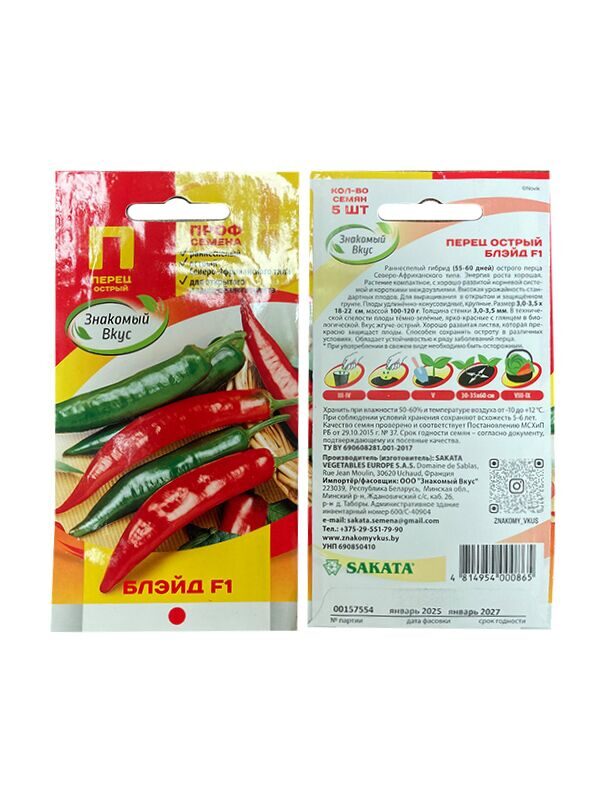 Семена перца острого Блэйд F1. БЛЭЙД F1 — раннеспелый гибрид острого перца Северо-африканского типа для получения ранней и основной продукции. Компактное здоровое растение с хорошо развитой корневой системой и короткими междоузлиями способно сформировать высокий урожай стандартных однотипных плодов. Листва прекрасно закрывает плоды от солнца. Плоды в технической спелости тёмно-зелёного цвета, в биологической спелости – красного цвета с глянцевым отливом. Жгучий острый вкус, который сохраняется даже в холодных условиях. Используется как для переработки, так и для сушки и свежего потребления.
