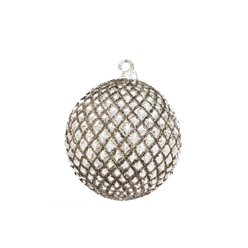 Красивый шар цвета античного серебра с рельефной поверхностью. Декор выполнен из блёсток в тон шара образовывающих узор в виде сеточки. Поверхность шара имеет необычную небного выпуклую фактуру из множества ромбиков. Смотрится просто потрясающе.